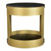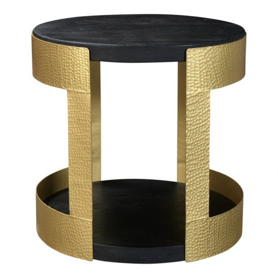 A stunning combination of black and gold. The hammered iron base of this table gives it an artisanal look and feel. Powder-coated in a brass finish for longevity. A round shape that's ideal for sofa-chiases and small rooms. We offer 1 year limited commercial warranty (covered for any manufacturer's defect).