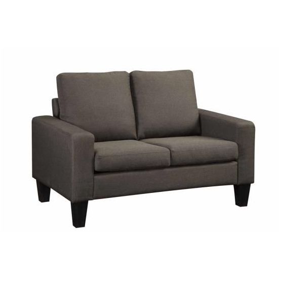 MODERN YET CASUAL DESIGN WITH STRONG BASE AND REMOVABLE BACK AND SEAT CUSHIONS. FULL METAL FRAME. UPHOLSTERED IN GREY LINEN- LIKE FABRIC WITH LEG FINISH IN CAPPUCCINO.