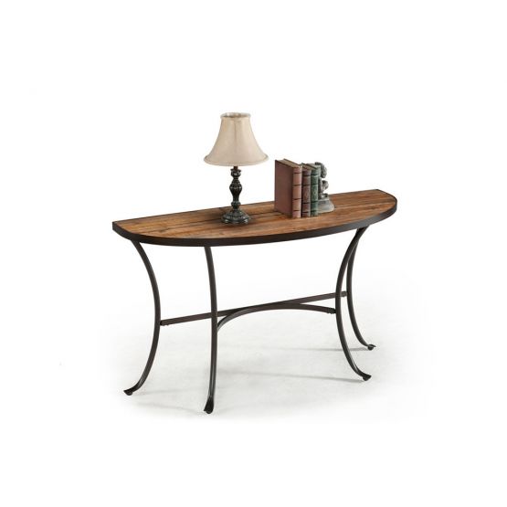 Transitional Burk-Lee Console bring an industrial feel to any space with a rustic and sophisticated silhouette. Planked reclaimed hardwood construction with a subtle distressed finish handsomely exposes the grain unique to each piece. Metal straps bordering the tops and metal tubed frames add even more character to this striking trio comprised of a cocktail table, end table, and sofa table.