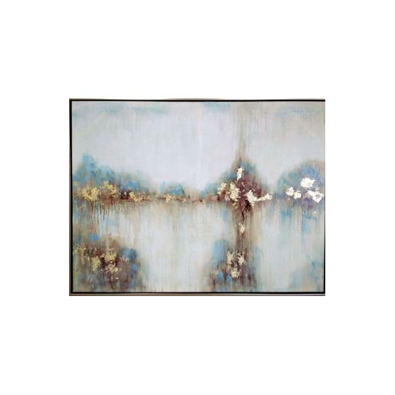 Large Hand Embellished Canvas Wrapped Art. Frame is in a warm nickel finish. Does not come standard with a hanging wire. Orientations are for existing hangers, but can be hung either direction.