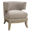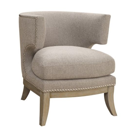 This unique upholstered grey accent chair features a barrel back design. The high arms are only attached to the back, leaving the base open exposing the plush seat cushion. The chair is further accented by nailhead trim and weathered wood trim and legs. This listing is for the accent chair only. Some assembly may be required.