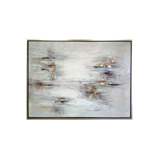 Large Hand Embellished Canvas Wrapped Art. Frame is in a warm nickel finish. Does not come standard with a hanging wire. Orientations are for existing hangers, but can be hung either direction.