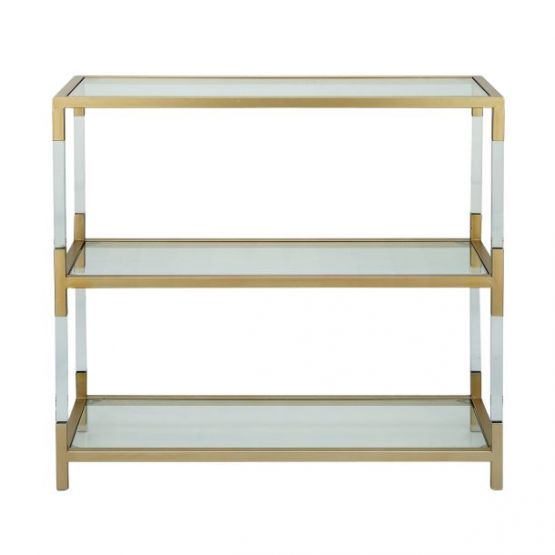 38" x 36" Modern Reflections Metal, Glass And Acrylic Console Shelf, Three Rectangular Clear Glass Shelves, Rectangular Metallic Gold Iron Frame With Clear Acrylic Accents.