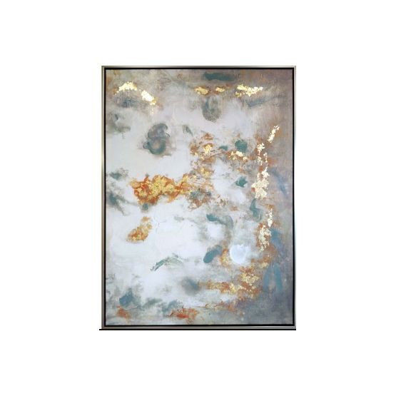 Large Hand Embellished Canvas Wrapped Art. Frame is in a warm nickel finish. Does not come standard with a hanging wire. Orientations are for existing hangers, but can be hung either direction.