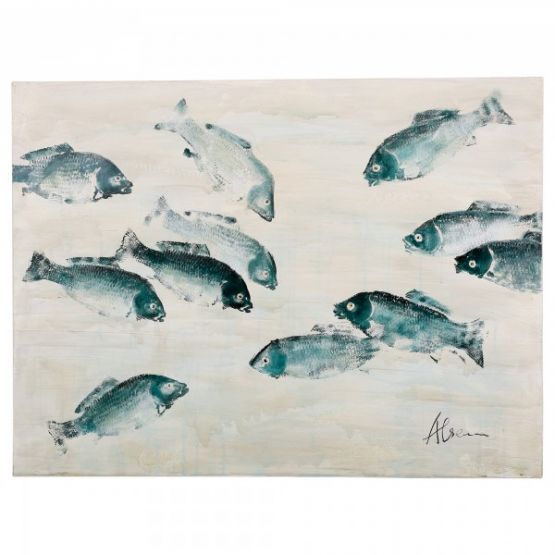 School of Blues Wall Art is warm and inviting. The grey rustic canvas has several teal and blue fish placed randomly around the canvas. Place this lovely beachy piece of artwork in any room of the home.