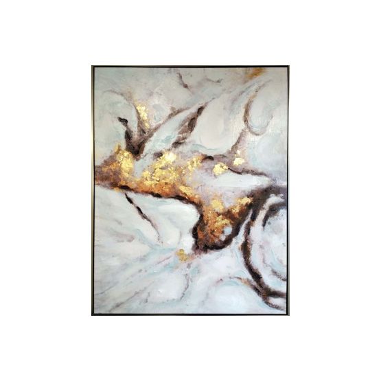 Large Hand Embellished Canvas Wrapped Art. Frame is in a warm nickel finish. Does not come standard with a hanging wire. Orientations are for existing hangers, but can be hung either direction.