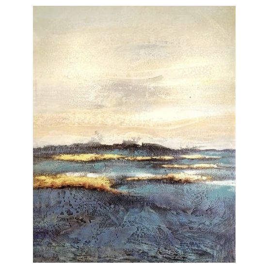 Large Hand Embellished Canvas Wrapped Art. Frame is in a warm nickel finish. Does not come standard with a hanging wire. Orientations are for existing hangers, but can be hung either direction.