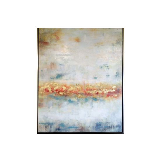 Large Hand Embellished Canvas Wrapped Art. Frame is in a warm nickel finish. Does not come standard with a hanging wire. Orientations are for existing hangers, but can be hung either direction.