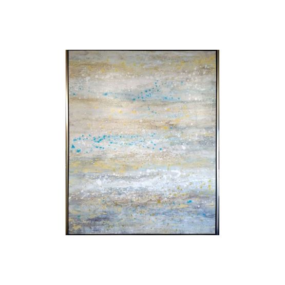 Large Hand Embellished Canvas Wrapped Art. Frame is in a warm nickel finish. Does not come standard with a hanging wire. Orientations are for existing hangers, but can be hung either direction.