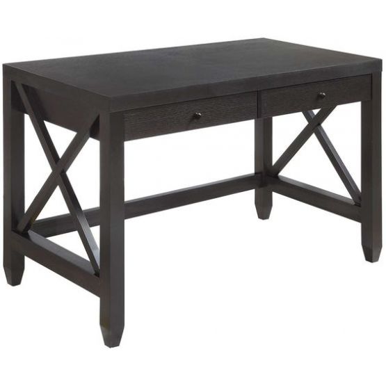 This Crawford Cappuccino Desk for your home office presents a centerpiece for your home office. Featuring tall legs with a side X-design, the table features two drawers with euro glides and cam locks. Completed with a cappuccino finish, the table is perfect for your books, laptop or writing utensils.