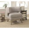 This unique upholstered grey accent chair features a barrel back design. The high arms are only attached to the back, leaving the base open exposing the plush seat cushion. The chair is further accented by nailhead trim and weathered wood trim and legs. This listing is for the accent chair only. Some assembly may be required.