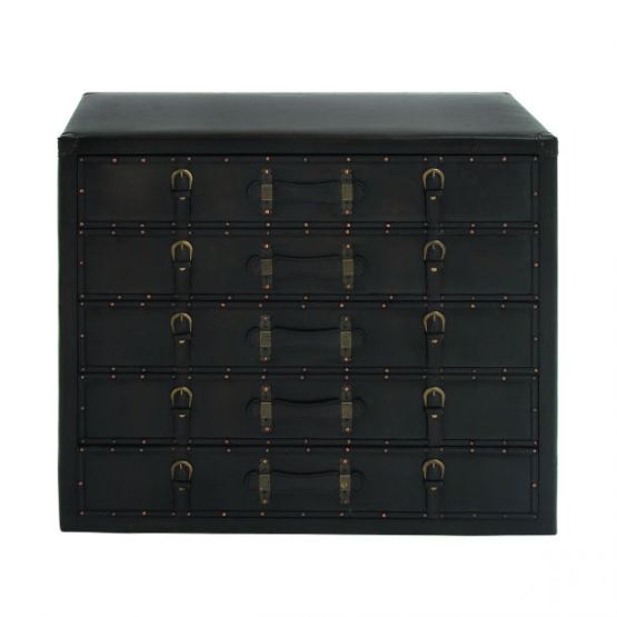 This chest features an old world design with its faux leather coverings in a dark espresso finish. It is made of sturdy wood materials with 5 rectangular drawers that provide ample space for storage. This wooden chest is designed with buckle straps and metal bolts, making it a perfect storage piece with a classic and antique touch.