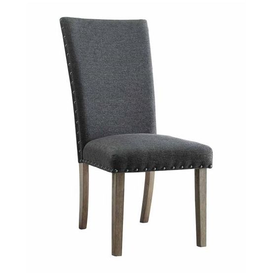 A classic Parson Chair pairs with any table style. This upholstered chair is stunning with a high back creating a comfortable seat. Framed with large nickel nailheads and the weathered legs adds a rustic look to this classic chair.