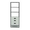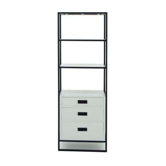 This shelf unit features 2 rectangular shelf tops and 3 rectangular drawers made of Chinese red pine wood, offering convenient storage and display options for homes and offices. A rectangular iron frame provides sturdy support and stability to this shelf unit. This shelf unit's metallic black and white finishes create a sleek and elegant look fit for modern interior design settings.