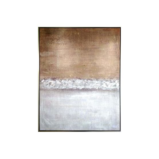 Large Hand Embellished Canvas Wrapped Art. Frame is in a warm nickel finish. Does not come standard with a hanging wire. Orientations are for existing hangers, but can be hung either direction.